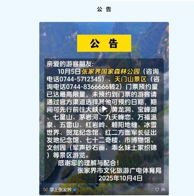国庆中秋假期,湖南省张家界市文旅部门连续数日发布公告,张家界国家森林公园门票预约量已达最高限量,提醒未预约到门票的游客通过官方渠道选择其他可预约日期永宝网,期间可先行前往其他景区游览。